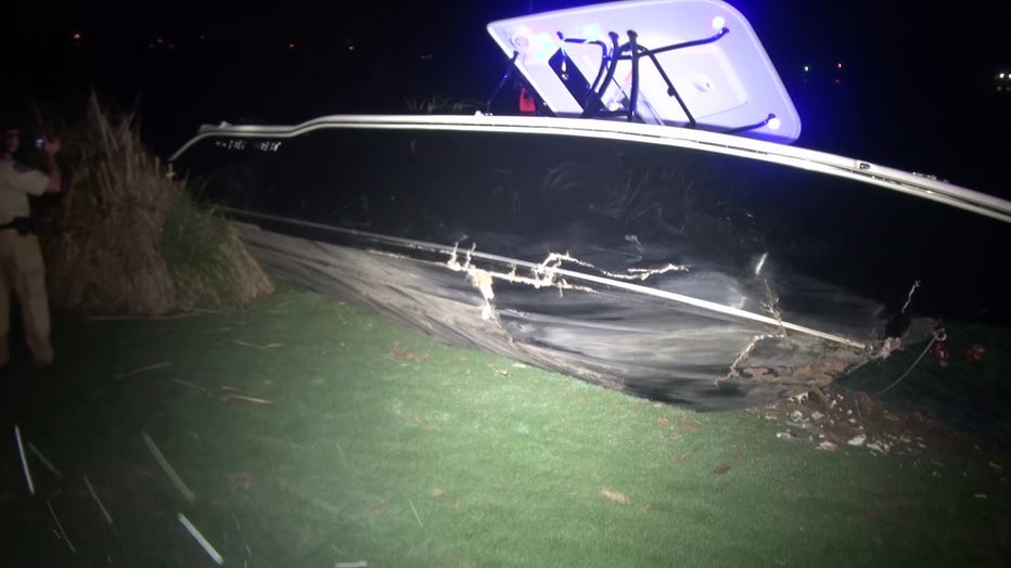 Authorities were called out around 3 a.m. about a boat crash that slammed into April Plaza Marina before landing on a golf course with at least four people on board.