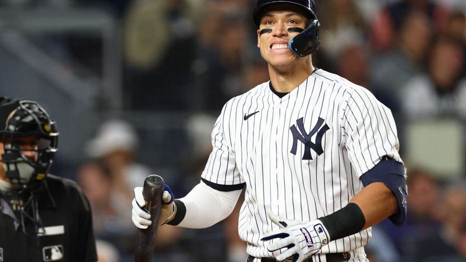 NEW YORK, NEW YORK - OCTOBER 22: Aaron Judge #99 of the New York Yankees reacts after striking out against the Houston Astros during the fourth inning in game three of the American League Championship Series at Yankee Stadium on October 22, 2022 in N