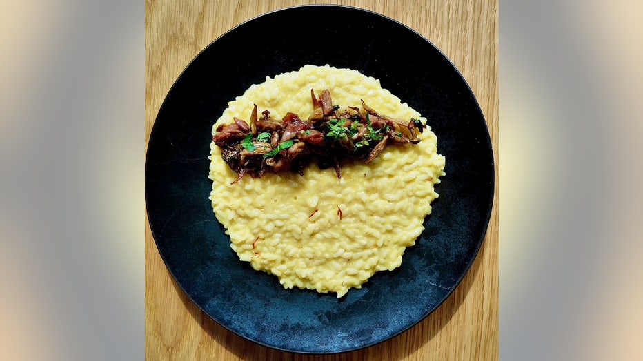 Risotto with Saffron uses turkey broth to make the risotto and incorporates bits of left over leg meat sauteed in butter with mushrooms