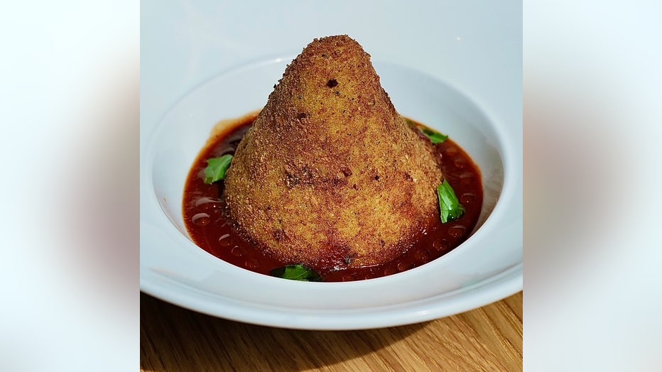 The Texas-sized Arancini is made with unused leftover stuffing bread crumbs, turkey meat and gravy. Feel free to add in a little stuffing as well. It’s served on a bed of spicy marinara sauce.