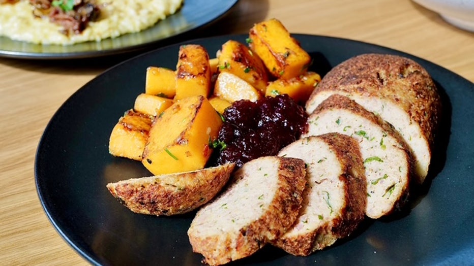 Turkey Meatloaf, utilizes leftover turkey meat ground and seasoned with Italian spices, served with sweet potatoes and cranberry relish.