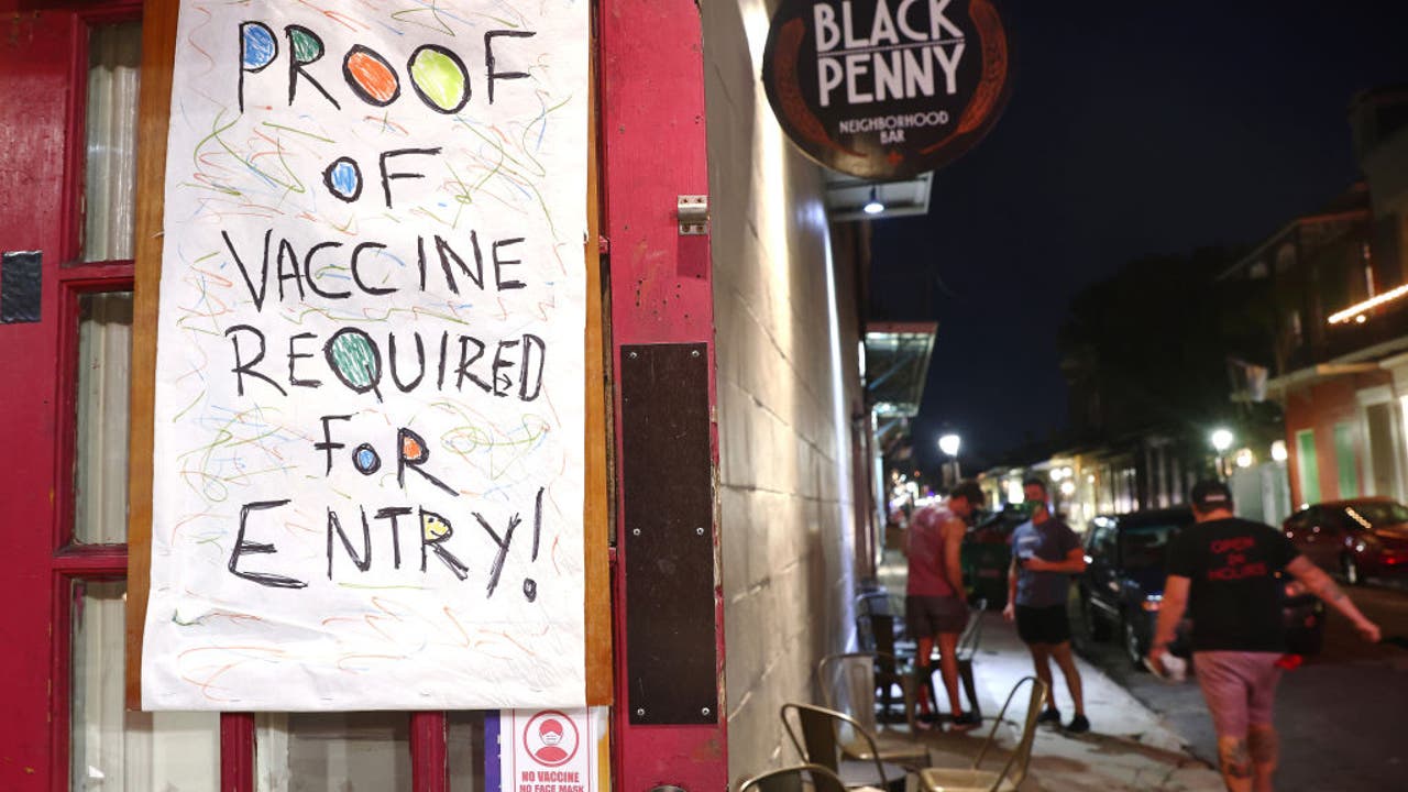 A sign reads 'Proof Of Vaccine Required For Entry' at a bar in the French Quarter on Aug. 16, 2021 in New Orleans, Louisiana. (Photo by Mario Tama/Getty Images)