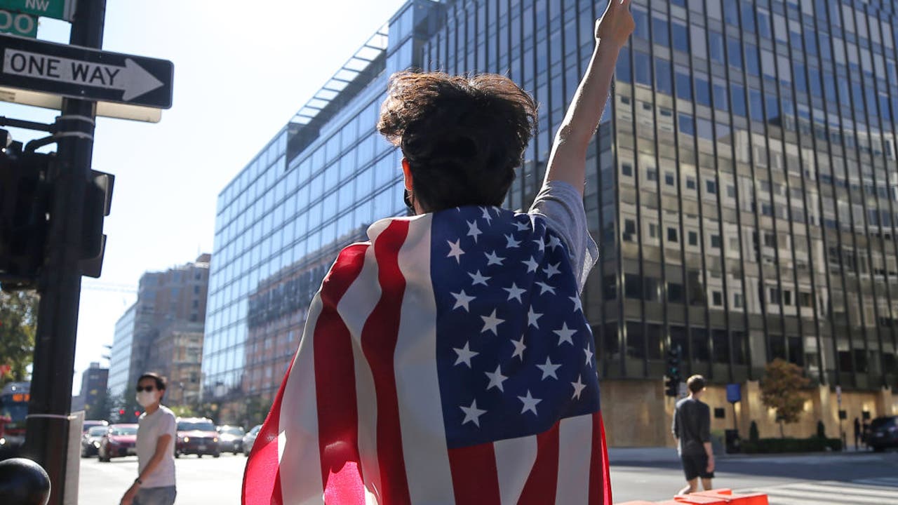 FILE - A man holds a US flag on his shoulders after the media announcement that Democratic Party nominee Joe Biden has won the 2020 US presidential election. (Yegor AleyevTASS via Getty Images)