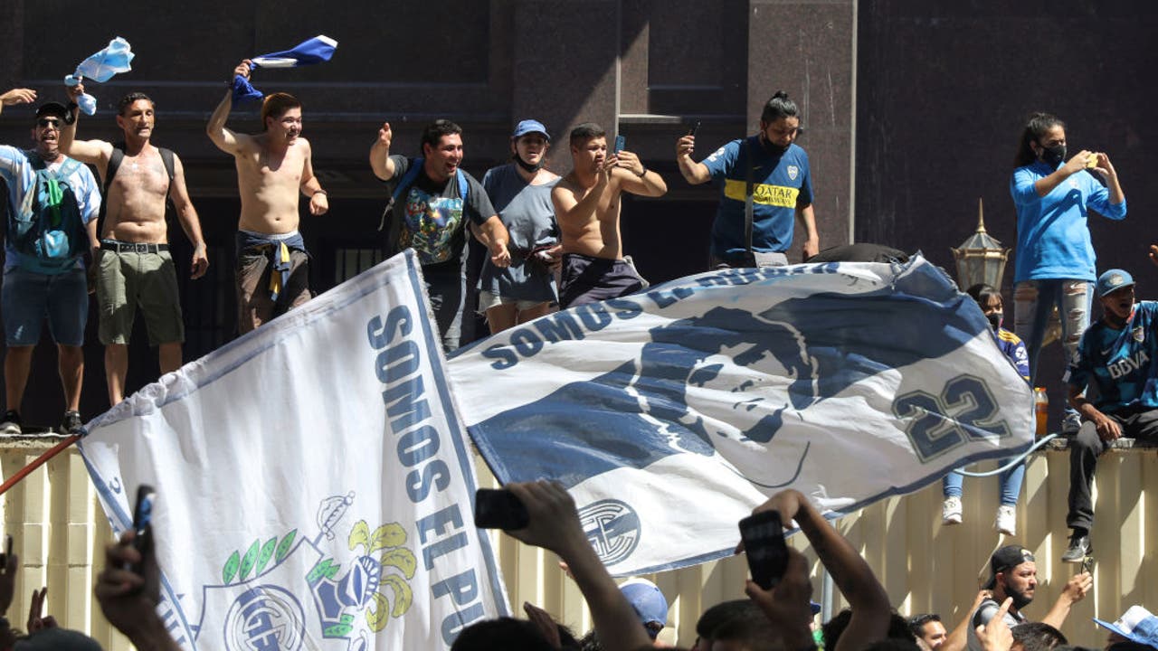BUENOS AIRES, ARGENTINA - NOVEMBER 26: Fans cheer and shout to pay tribute during the burial ceremony of Argentine football legend Diego Maradona at Jardin Bellavista on November 26, 2020 in Bellavista, Buenos Aires, Argentina. (Photo by Tomas Cuesta
