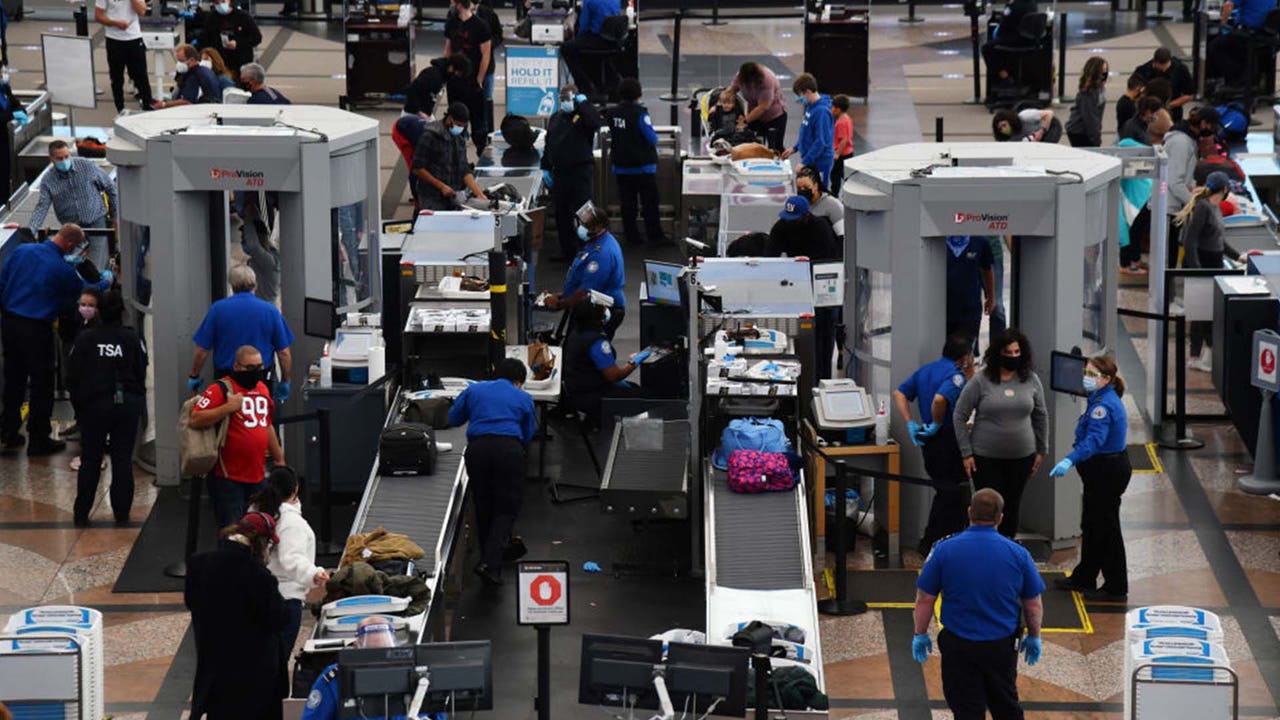 FILE - Transportation Security Administration crews are checking baggages of travelers at the security checking point of Denver International Airport in Denver, Colorado on Friday. Nov. 20, 2020.