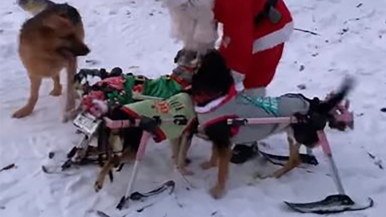 Adorable dogs with special needs play in snow during holiday season
