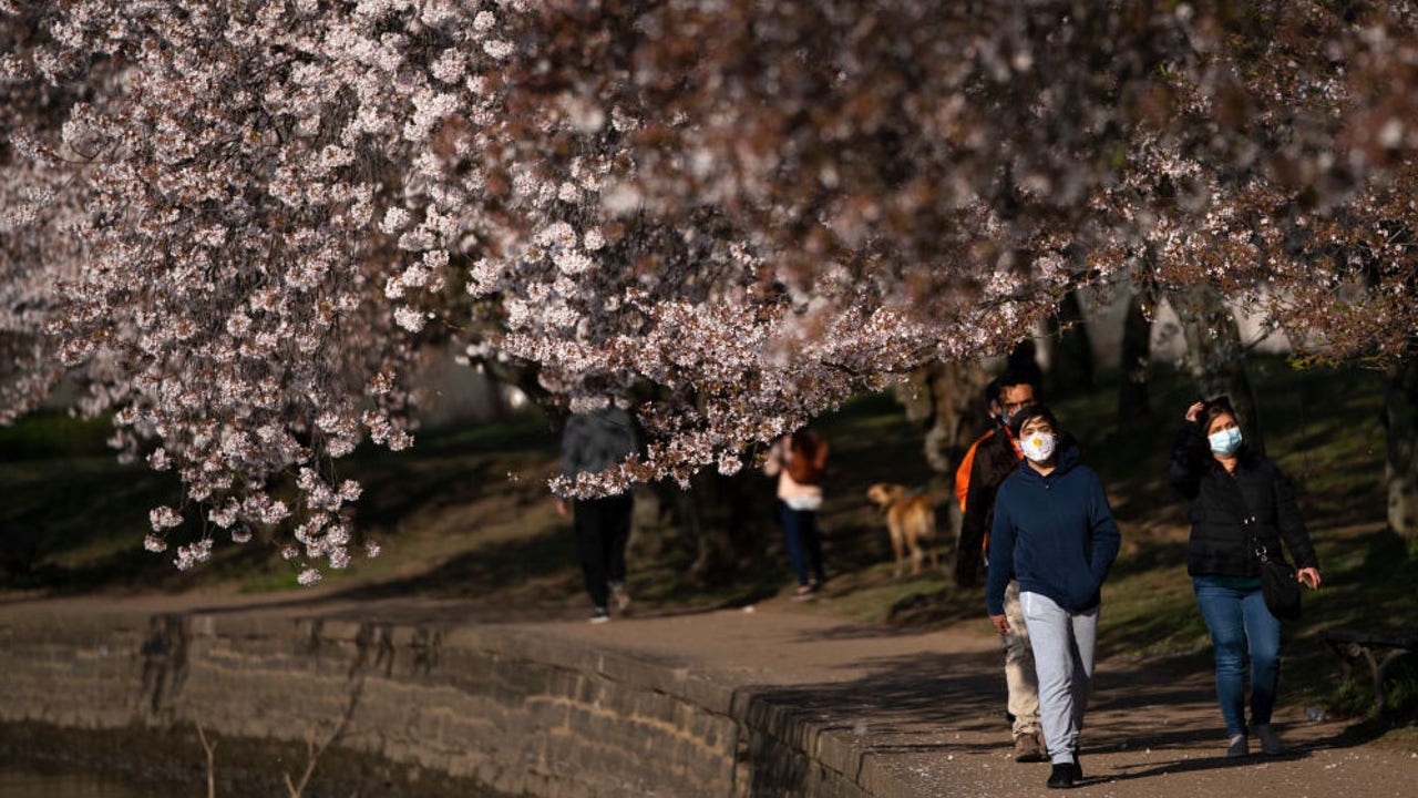 People walk under blooming cherry trees along the Tidal Basin on April 5, 2021 in Washington, DC. (Drew Angerer/Getty Images)