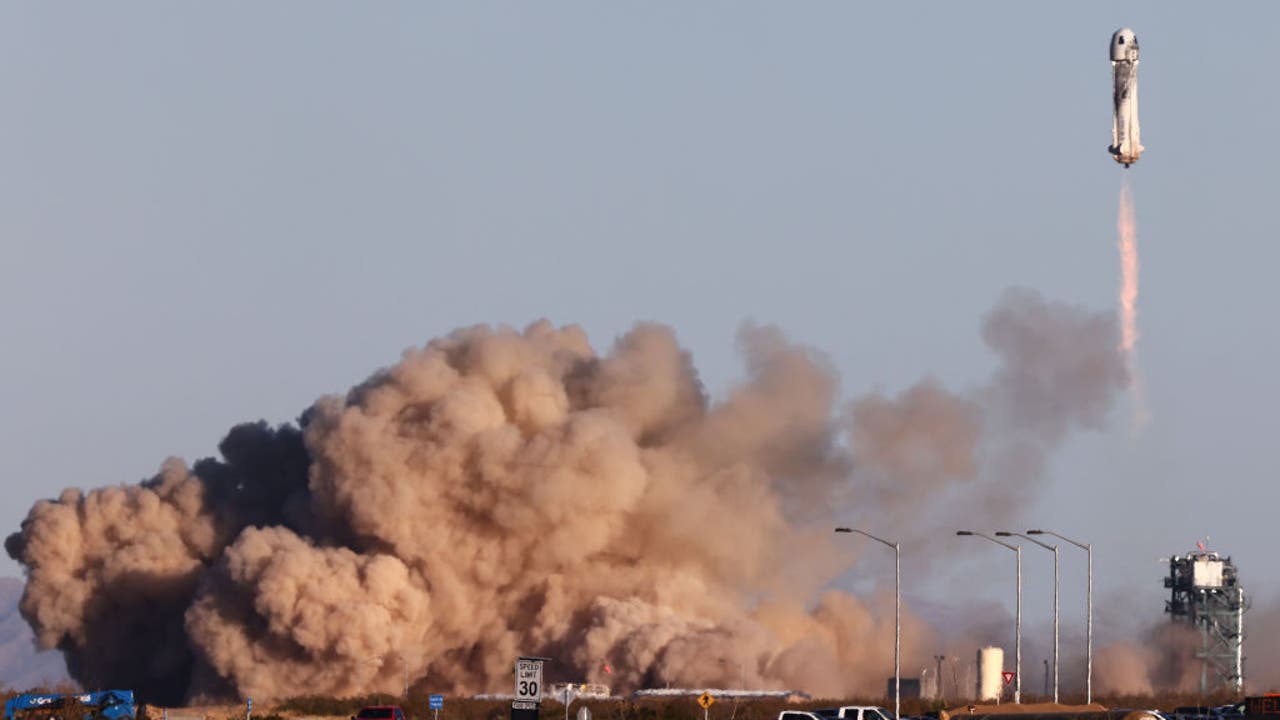 VAN HORN, TEXAS - DECEMBER 11: Blue Origin’s New Shepard lifts off from the Launch Site One launch pad carrying Good Morning America co-anchor Michael Strahan, Laura Shepard Churchley, daughter of astronaut Alan Shepard, and four other civilians on D
