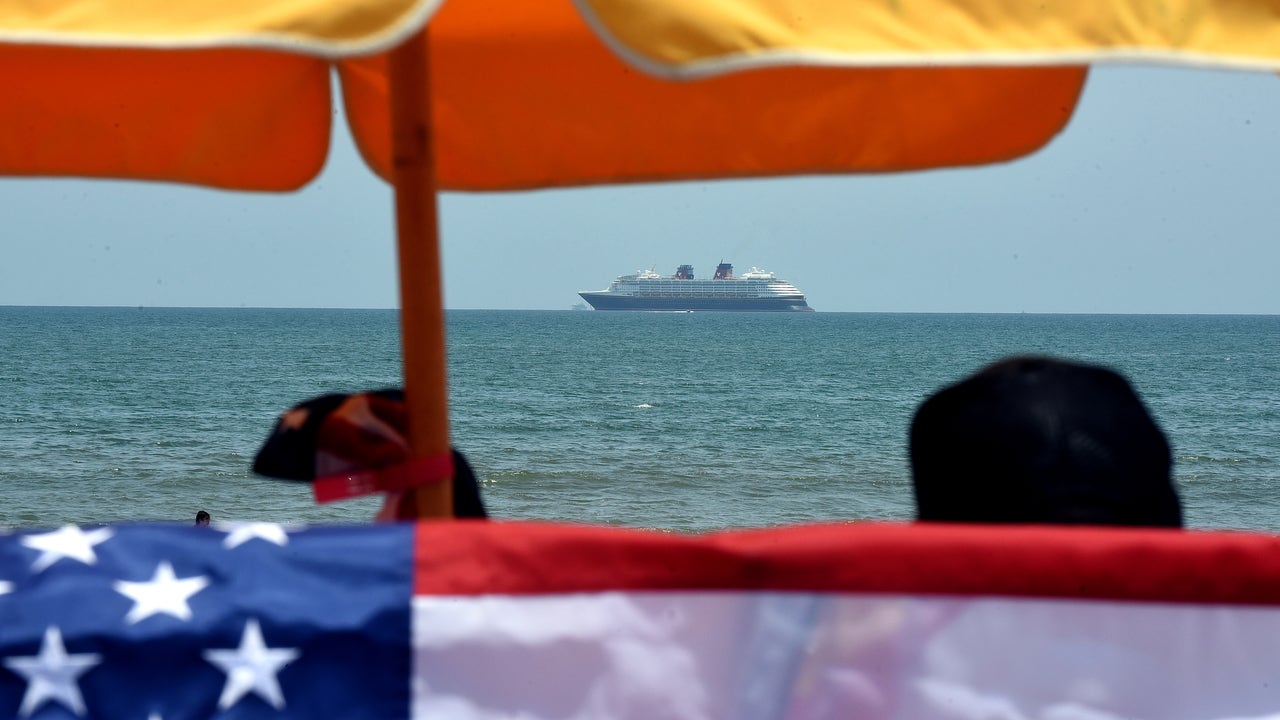 A Disney cruise ship is seen anchored off shore on Independence Day, July 4, 2020 in Cocoa Beach, Florida. Crowds at the beach were below normal for a holiday weekend due to the coronavirus pandemic and a spike in COVID-19 cases in Florida. Cruise sh