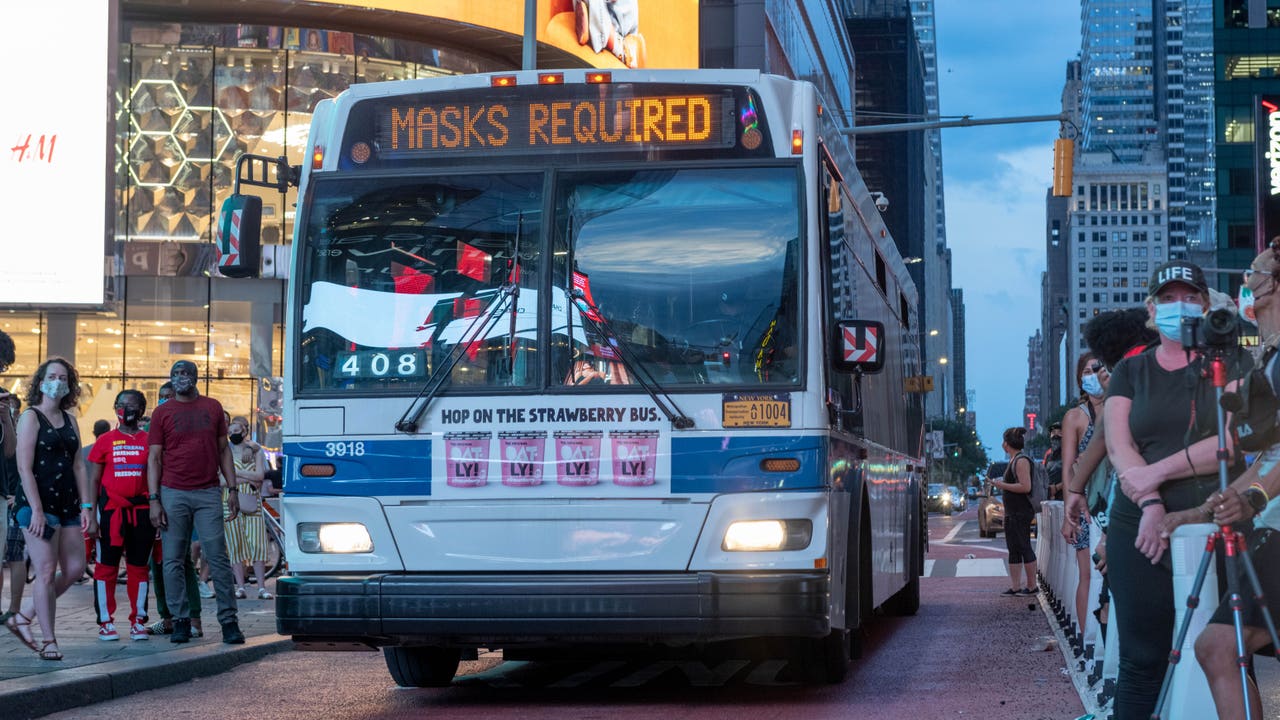 A sign on the front of a bus reads, "Masks required" in Times Square as the city moves into Phase 3 of re-opening following restrictions imposed to curb the coronavirus pandemic on July 12, 2020 in New York City. (Photo by Alexi Rosenfeld/Getty Image