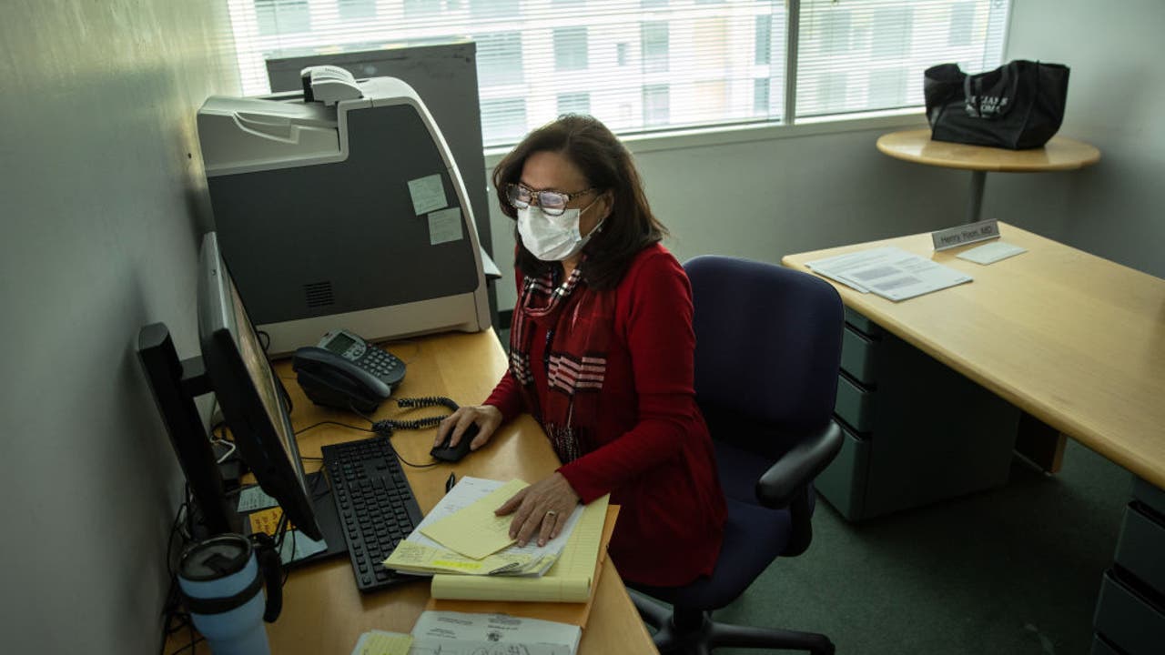STAMFORD, CONNECTICUT - DECEMBER 22: City of Stamford contact tracer Toni Parlanti checks a list of people having been identified as potentially exposed to coronavirus while working from her office at the Government Center on December 22, 2020 in Sta