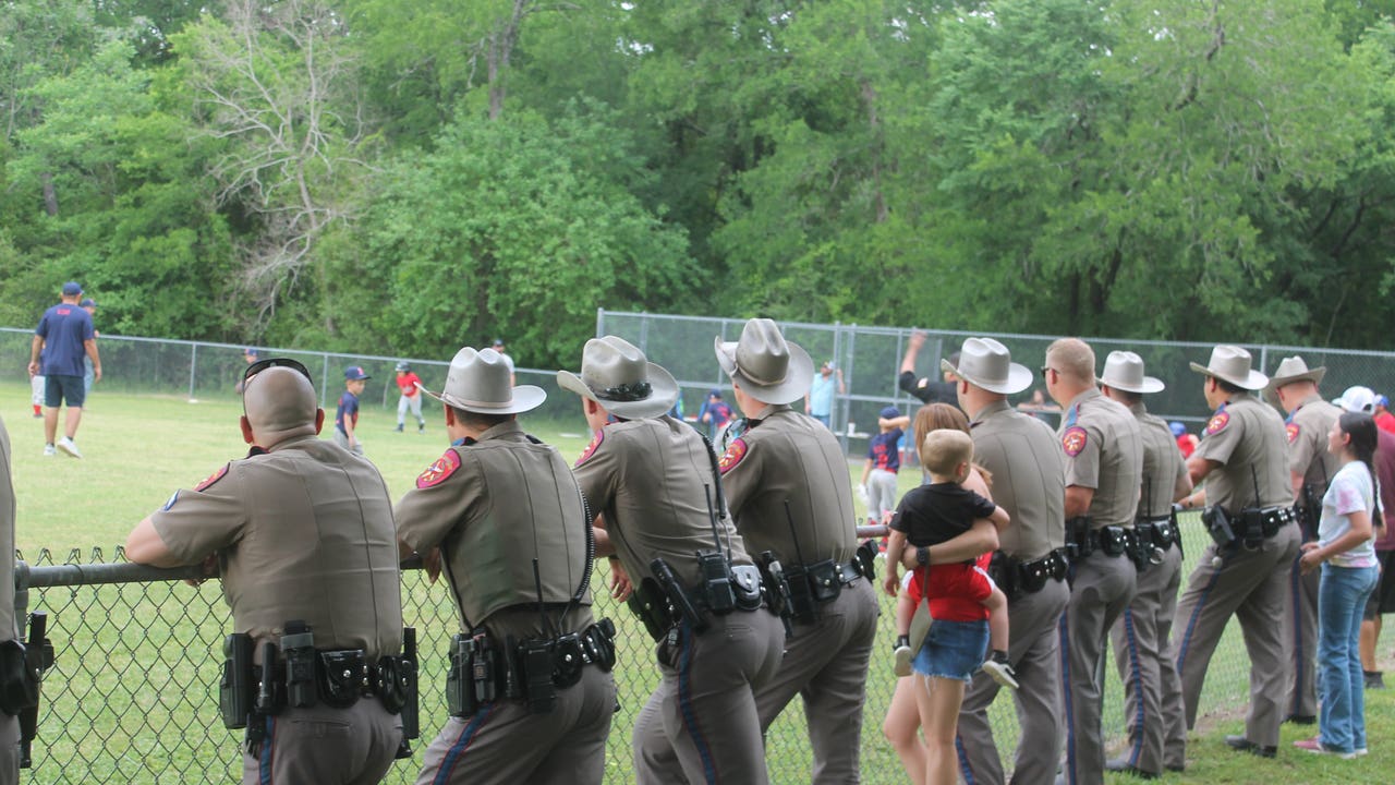 BRYAN, Texas - Texas DPS troopers stood on the sidelines at a baseball game in support of the family of a fellow trooper who had been shot while pursuing a mass shooting suspect.