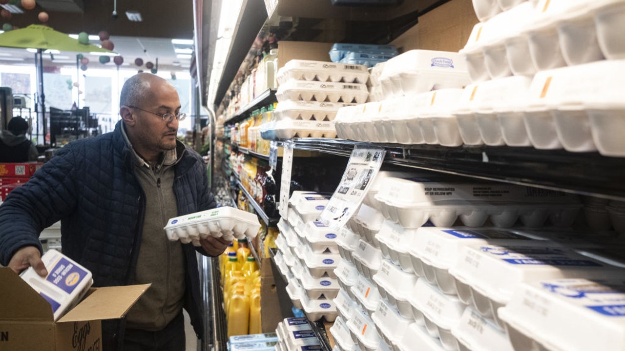FILE-A worker stocks eggs on a shelf at a grocery store in 2023. ( Matthew Hatcher/Bloomberg via Getty Images)