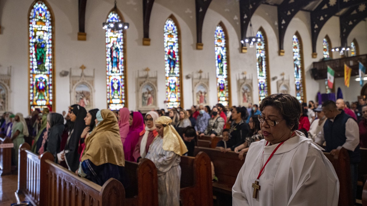Parishioners pack the pews of the church as they celebrates the Roman Catholic Holiday of Good Friday at the church of St. Rose of Lima Parish in Chelsea, Massachusetts on April 15, 2022. (Photo by Joseph Prezioso/Anadolu Agency via Getty Images)