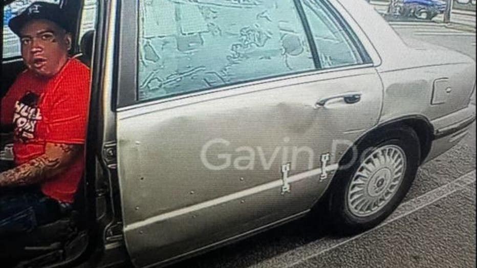 The suspect is described as a Hispanic male, wearing an orange shirt and blue jean pants.