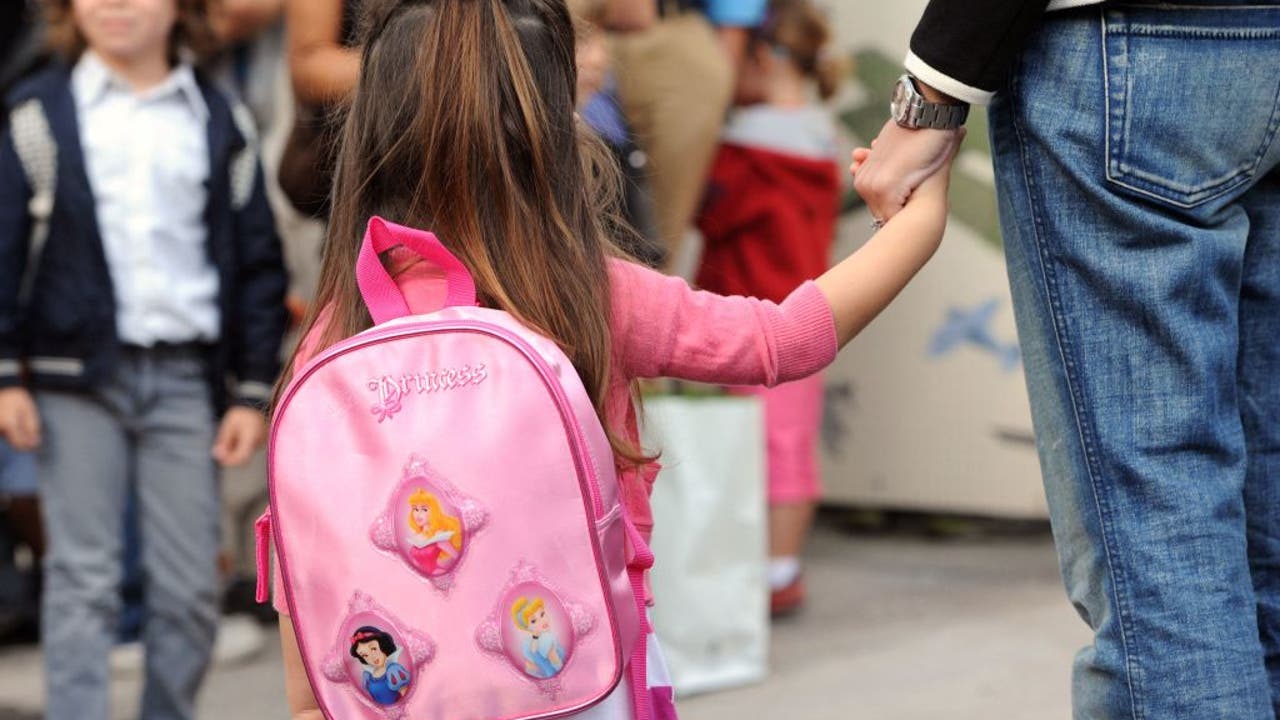 A girll holds the hand of her mother in the courtyard at school. (Credit: Anne-Christine POUJOULAT / AFP via Getty Images)
