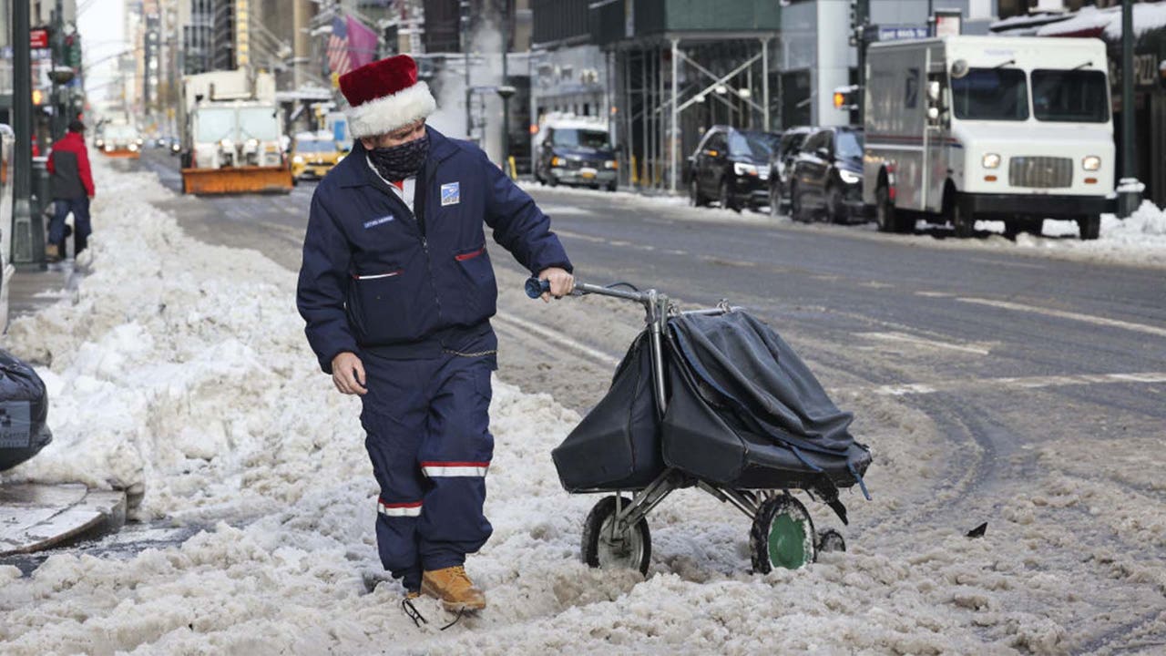 FILE - A U.S. Postal Service (USPS) worker wearing a protective mask and Santa Claus hat pulls a cart of mail through snow in New York, U.S., on Thursday, Dec. 17, 2020.