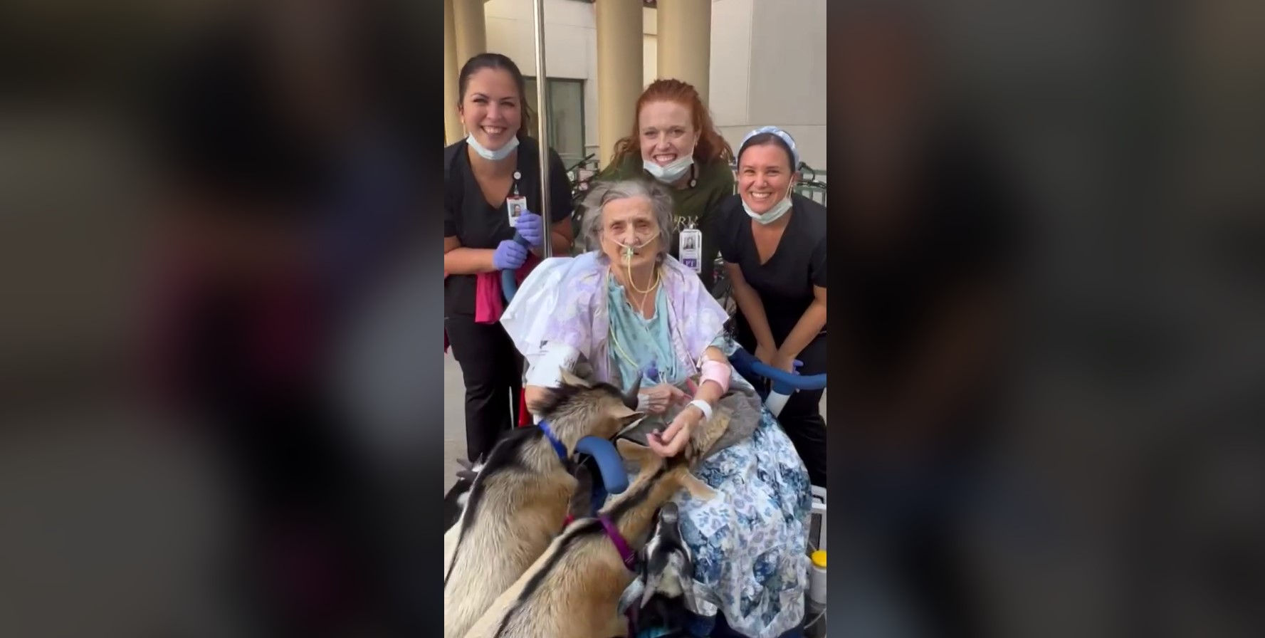 Danny Nudels Shiflet shared a video on his Facebook of his mother surrounded by her five goats while she receives care in the Intensive Care Unit at Memorial Hermann Hospital in Downtown Houston.