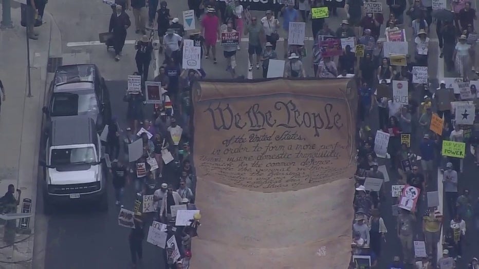 Houston protestors are seen carrying a large replica of the U.S. Constitution.