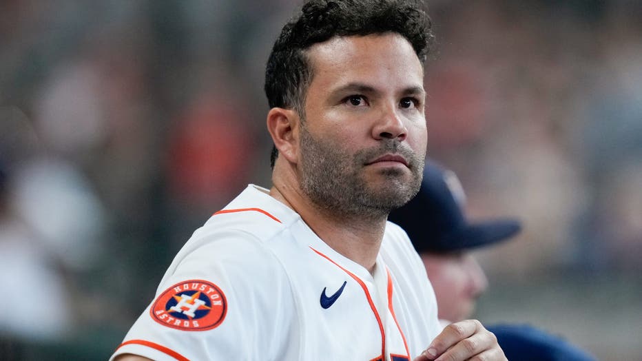 HOUSTON, TX - MARCH 26: Jose Altuve #27 of the Houston Astros looks on from the dugout during the game between the Los Angeles Angels and the Houston Astros at Daikin Park on Thursday, March 26, 2026 in Houston, Texas. (Photo by Kevin M. Cox/MLB Phot