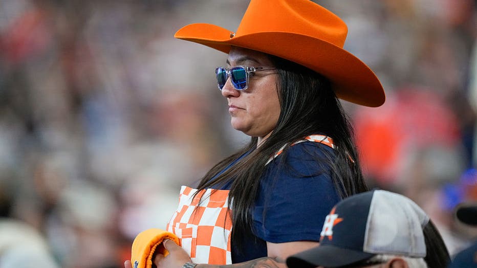 HOUSTON, TX - MARCH 26: A fan of the Houston Astros looks on during the game between the Los Angeles Angels and the Houston Astros at Daikin Park on Thursday, March 26, 2026 in Houston, Texas. (Photo by Kevin M. Cox/MLB Photos via Getty Images)