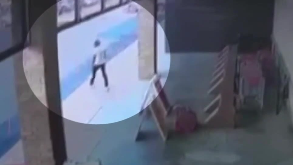 Surveillance video from a nearby business shows a man approaching the woman from behind, shoving her to the ground, then casually walking away.