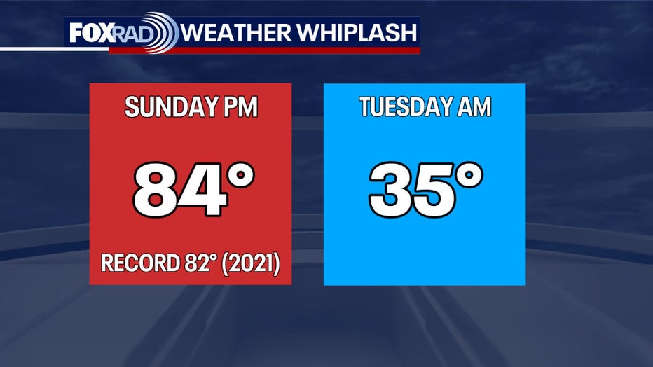 Temperatures will fall quickly behind the front, with breezy north winds with gusts ranging from 20 to 30 mph ushering in much cooler, drier air Monday morning.