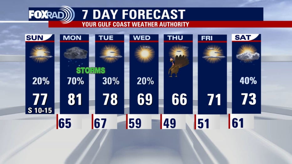 Temperatures are set to drop, bringing a more seasonal feel to the area with lower humidity. Highs are expected to be in the 60s for Thanksgiving Day, with overnight lows falling into the 40s and 50s throughout the long holiday weekend.