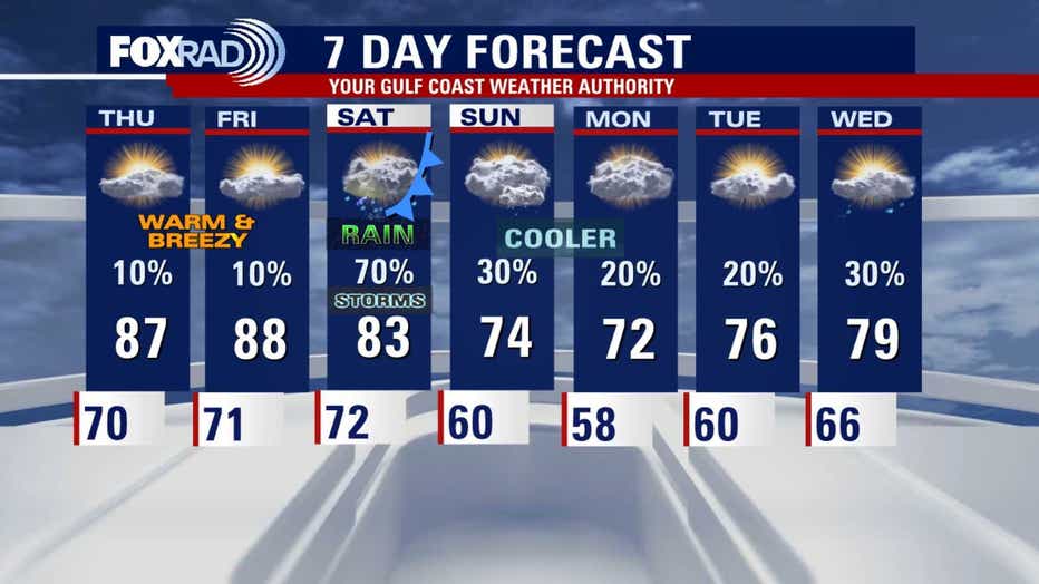 Behind the front, temperatures drop back into the 70s early next week with a slight dip in humidity. We may also be in store for light jacket weather by Monday morning as many areas dip to the 50s. Conditions turn quieter for a time before gradual warming & with better rain chances later in the week.