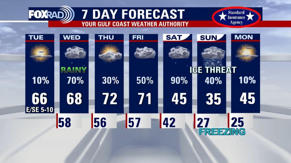 It's a clear, but cold Tuesday morning before things get cloudy and mild with highs in the mid-60s for the afternoon. We're also keeping an eye on the chances for ice and rain this coming weekend.