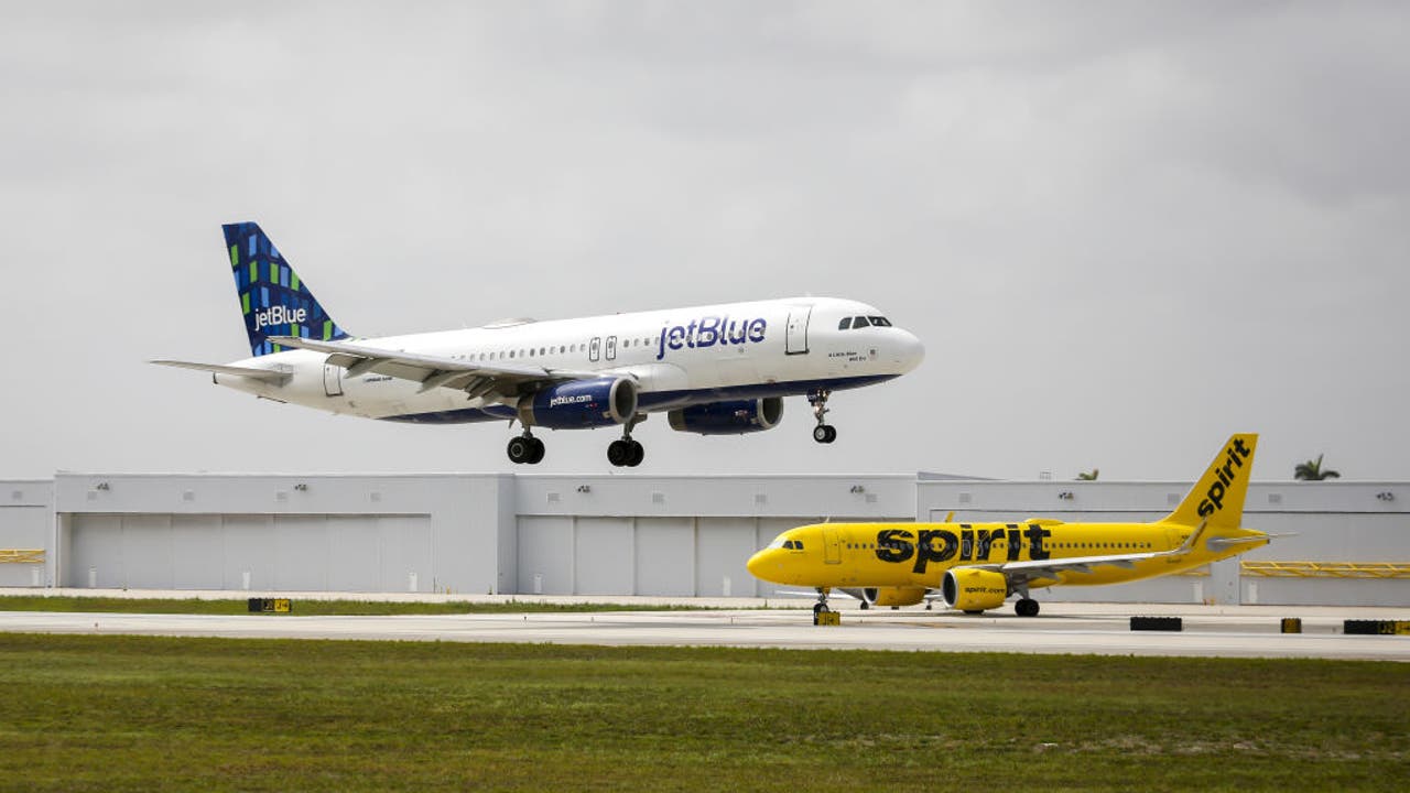 FILE - JetBlue and Spirit airplanes at Fort Lauderdale-Hollywood International Airport (FLL) in Fort Lauderdale, Florida, on May 21, 2022. Photographer: Eva Marie Uzcategui/Bloomberg via Getty Images