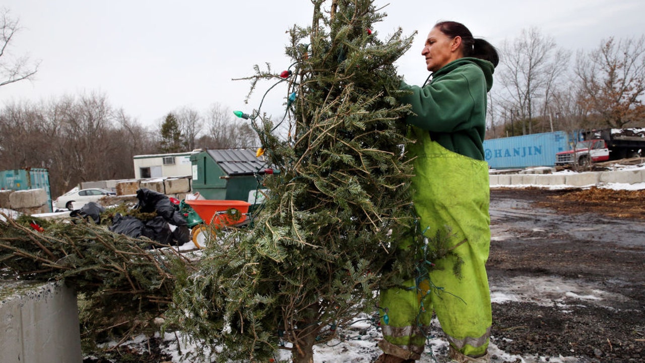 FILE- Jodi Sylvester-Dickerson removes lights and tinsel from Christmas trees at the Boston composting facility in Boston, MA. (Photo by Craig F. Walker/The Boston Globe via Getty Images)