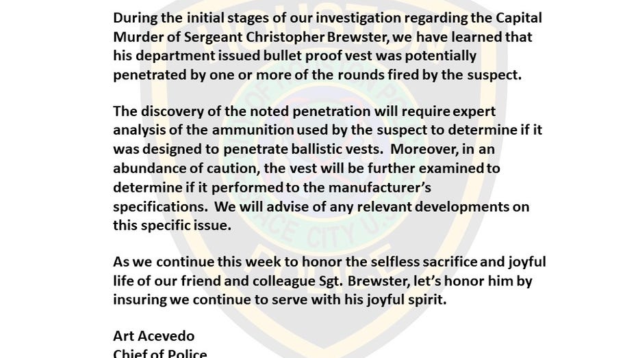 In a letter, the chief states Sgt. Brewster's vest was potentially penetrated by at least one bullet.
