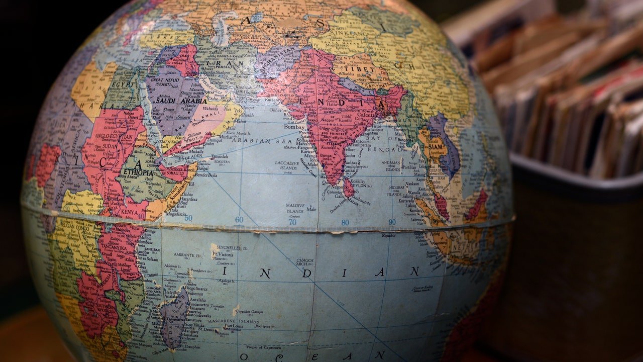 SANTA FE, NEW MEXICO - DECEMBER 9, 2019: A vintage globe of the world for sale in an antique shop showing the Indian Ocean and surrounding countries including India, the eastern coast of Africa and countries in the Middle East including Saudi Arabia.