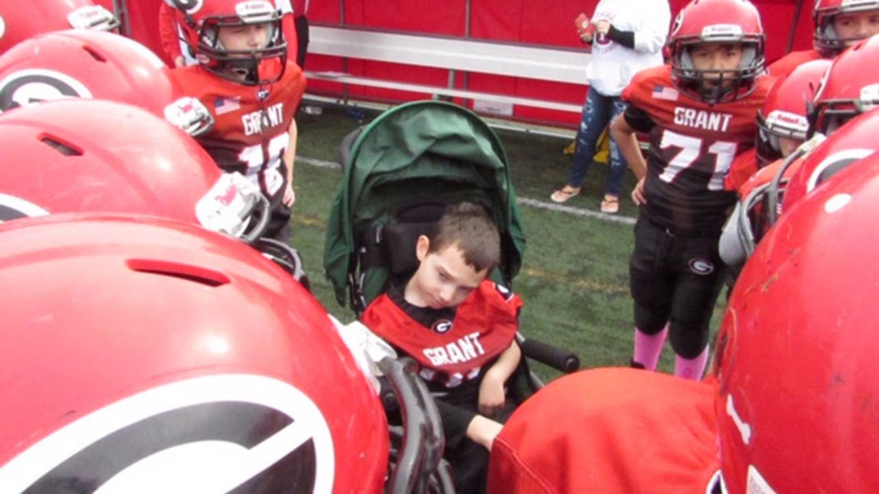 The Grant Jr. Bulldogs youth football team in Fox Lake, Ill., made Bryson Jenkins, who has cerebral palsy, the honorary captain on October 5 and now he is officially considered part of the team, Brittany Jenkins, Bryson’s mother, said. (Brittany Jenk