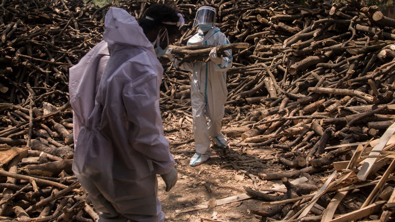 Cemetery workers wearing PPE sort logs of wood for the funeral pyres to perform the last rites of the patients who died of the COVID-19 on April 22, 2021 at a crematorium in the outskirts of New Delhi, India. (Photo by Anindito Mukherjee/Getty Images