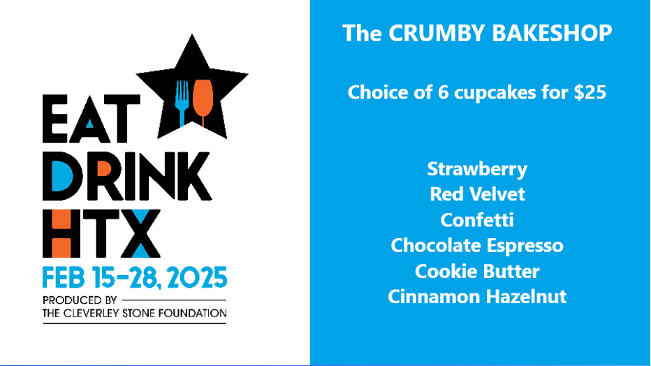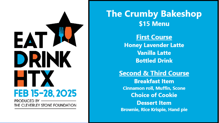 This year The Crumby Bakeshop has joined EatDrinkHTX with a $15 menu that offers a latte or a bottled drink and TWO items from the bakery shelves.