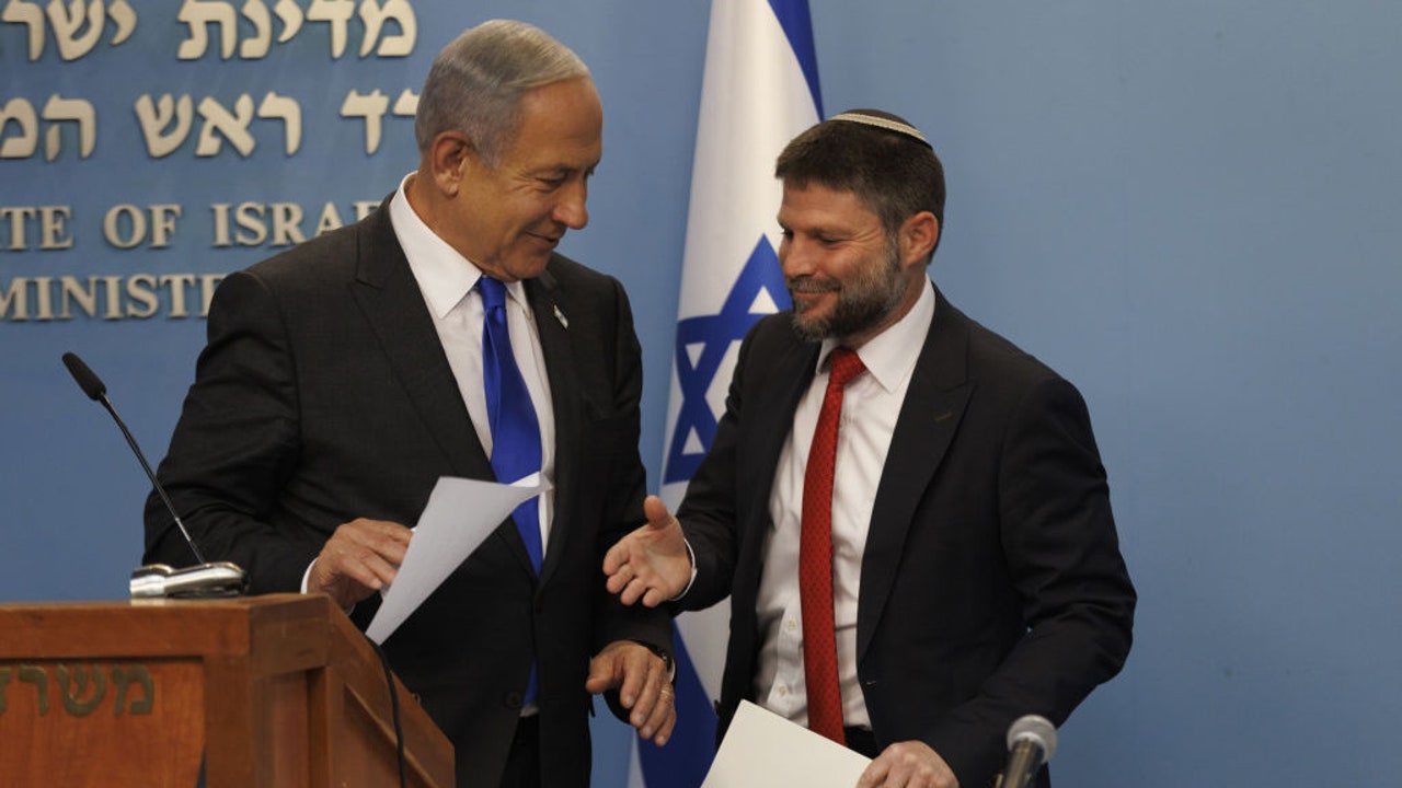 FILE-Bezalel Smotrich, Israels finance minister, greets Israeli Prime Minister Benjamin Netanyahu, left, during a news conference to present a cost of living plan on Jan. 11. 2023. (Kobi Wolf/Bloomberg via Getty Images)