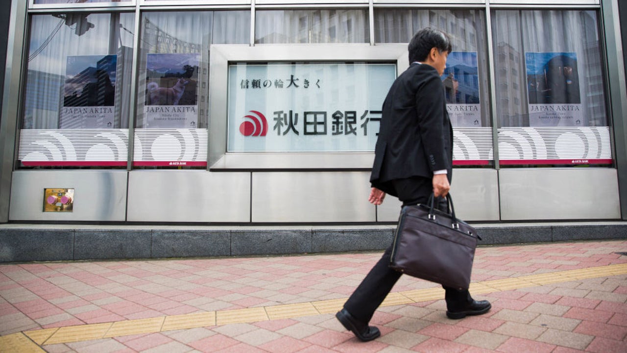 FILE - A man walks past the branch office of a bank in Japan. (Photo by Stanislav Kogiku/SOPA Images/LightRocket via Getty Images)