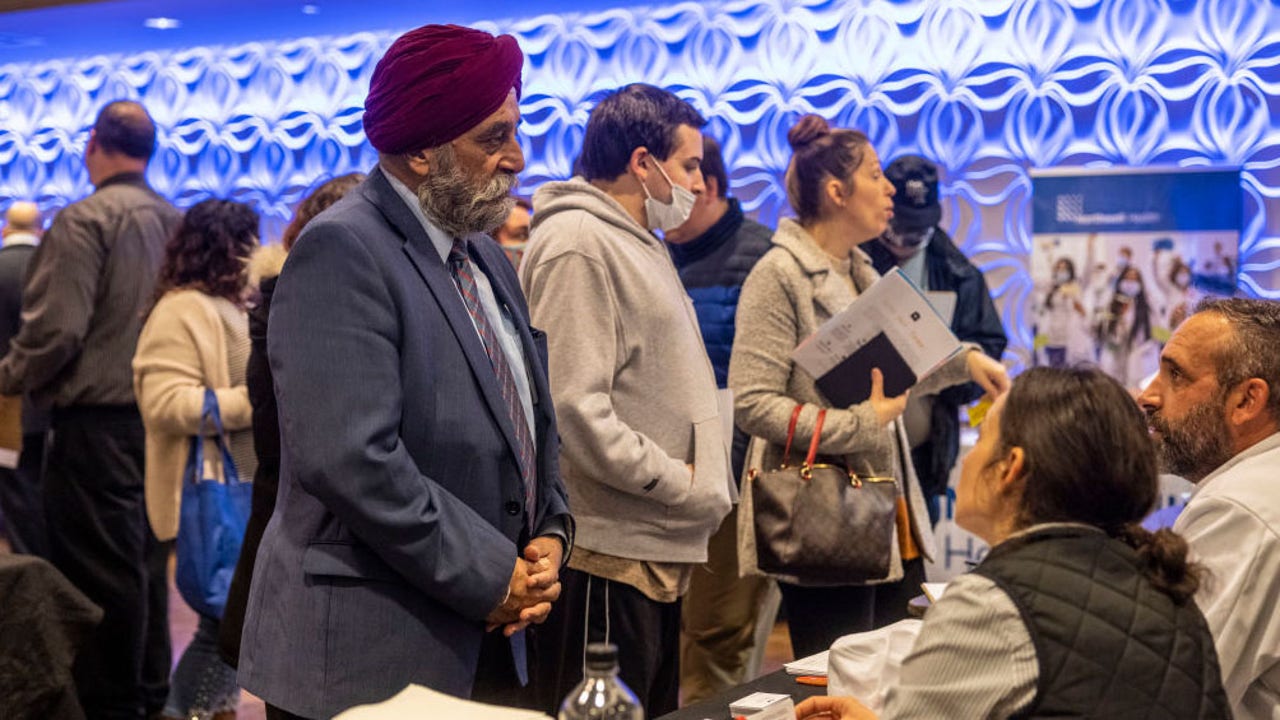 Job seekers and employers meet during a Job Fair at the Hotel Indigo in Riverhead, New York, on April 7, 2022. (Alejandra Villa Loarca/Newsday RM via Getty Images)