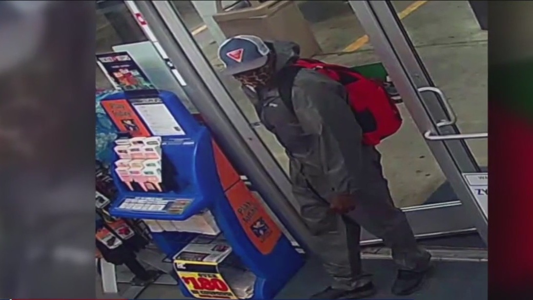 The suspect is described as a Black male, 5'8" to 5’10" tall, wearing a baseball cap, face mask, gray jumpsuit, black shoes and a red backpack. There is no description of a vehicle he may have used.
