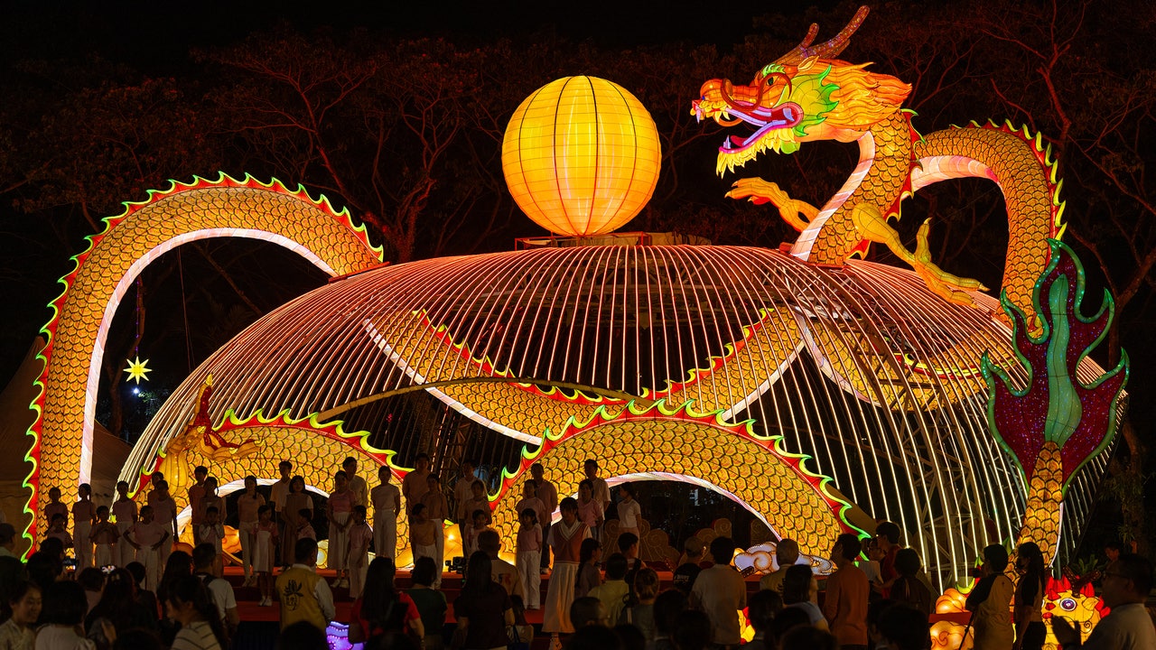 People visit a dragon lantern decoration with energy-saving LED lights ahead of the lunar new year at the Fo Guang Shan Dong Zen temple in Jenjarom, some 50 kilometres southwest of Kuala Lumpur on January 26, 2024. (Photo by Mohd RASFAN / AFP) (Photo