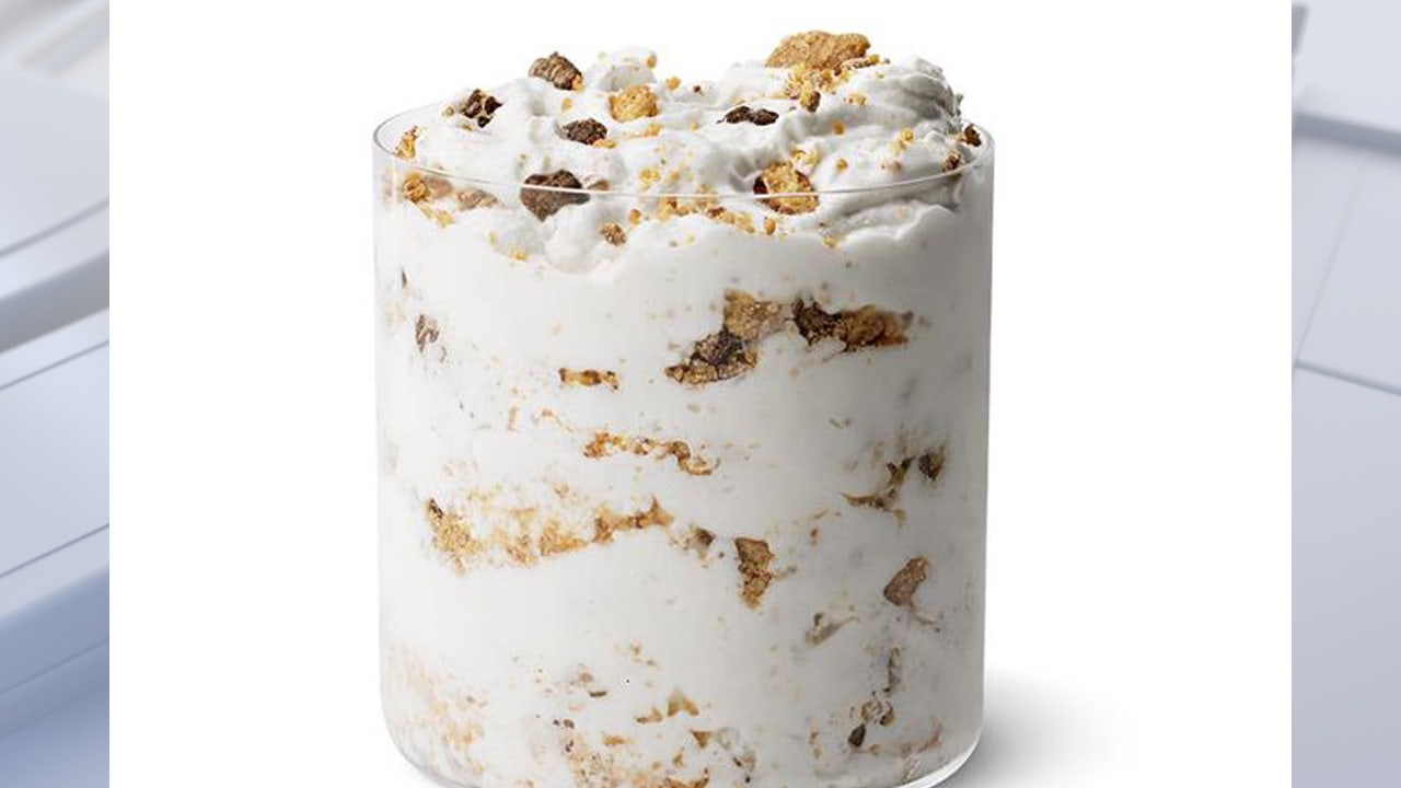 It’s made with vanilla soft serve and blended with cereal mix and peanut butter-chocolate cookie pieces.