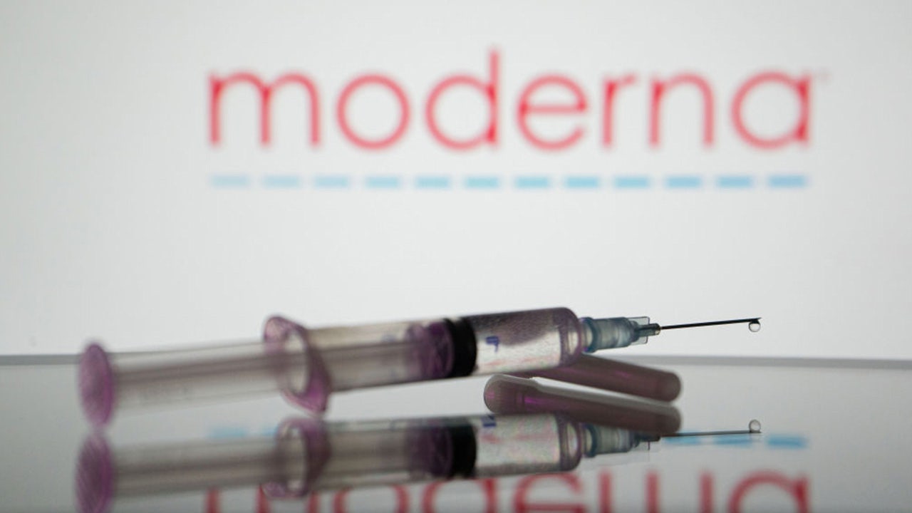 FILE - In this photo illustration, a medical syringe is displayed on a screen, and the logo of Moderna in the background. (Nikos Pekiaridis/SOPA Images/LightRocket via Getty Images)