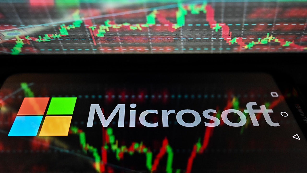 In this photo illustration, the Microsoft logo seen displayed on a smartphone with stock market exchange in the background. (Photo Illustration by Omar Marques/SOPA Images/LightRocket via Getty Images)