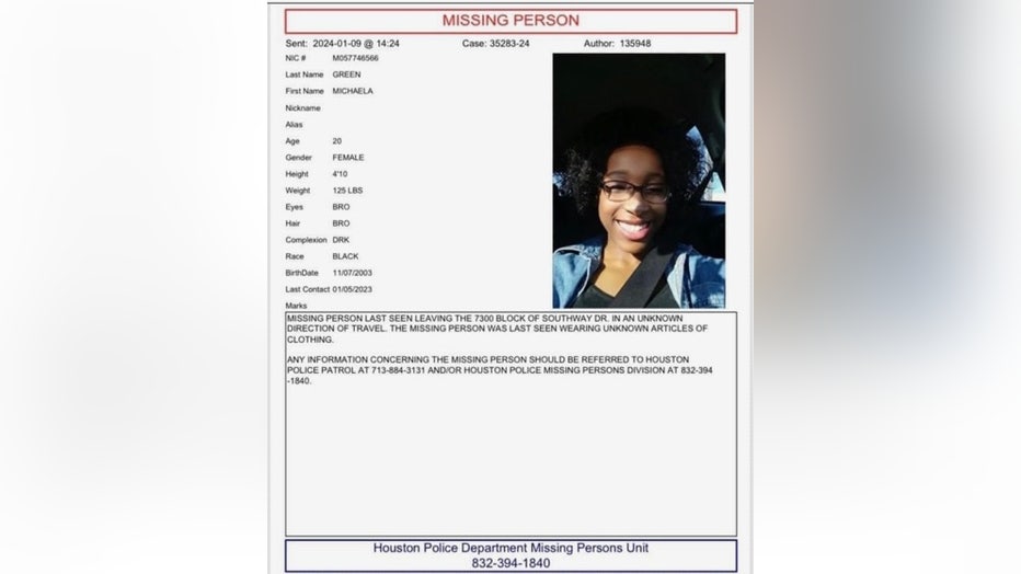 HOUSTON - Houston police confirm that 20-year-old Michaela Green is a missing person. They say she was last heard from on Jan. 5 and reported missing on Jan. 8.