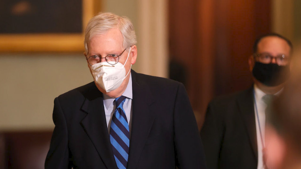 FILE - Senate Majority Leader Mitch McConnell leaves the Senate chamber on Jan. 19, 2021 in Washington, DC.