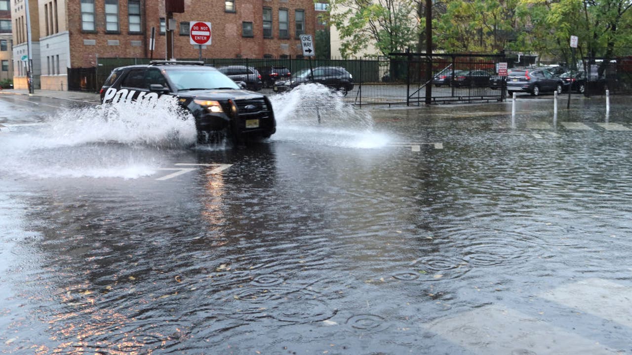 HOBOKEN, NJ - OCTOBER 26: A police car drives through a flooded intersection as a Nor'easter storm passes through the New York and New Jersey area on Oct. 26, 2021, in Hoboken, New Jersey. (Photo by Gary Hershorn/Getty Images)