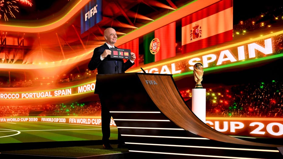 ZURICH, SWITZERLAND - DECEMBER 11: FIFA President Gianni Infantino announces Morocco, Portugal and Spain as the hosts of the FIFA World Cup 2030 during the Extraordinary FIFA Congress 2024 at the Home of FIFA on December 11, 2024 in Zurich, Switzerla