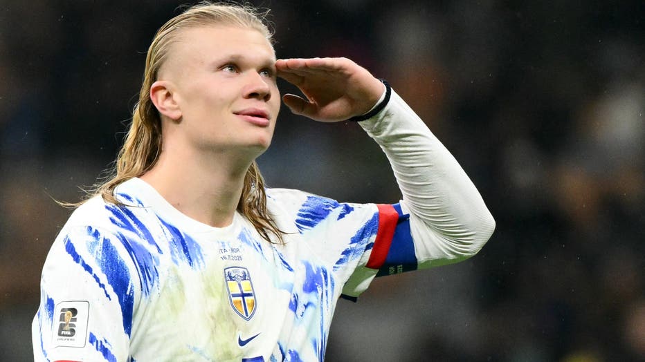 TOPSHOT - Norway's captain #09 Erling Braut Haaland celebrates scoring his team's second goal during the FIFA World Cup 2026 European qualification football match between Italy and Norway, at the San Siro Stadium, in Milan, on November 16, 2025. (Pho
